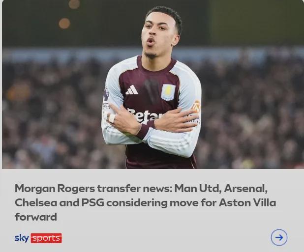 天空体育记者LT、KS和DK综合啥消息,阿森纳、切尔西、曼联以及巴黎都在考虑今夏求购维拉的摩根-罗杰斯。